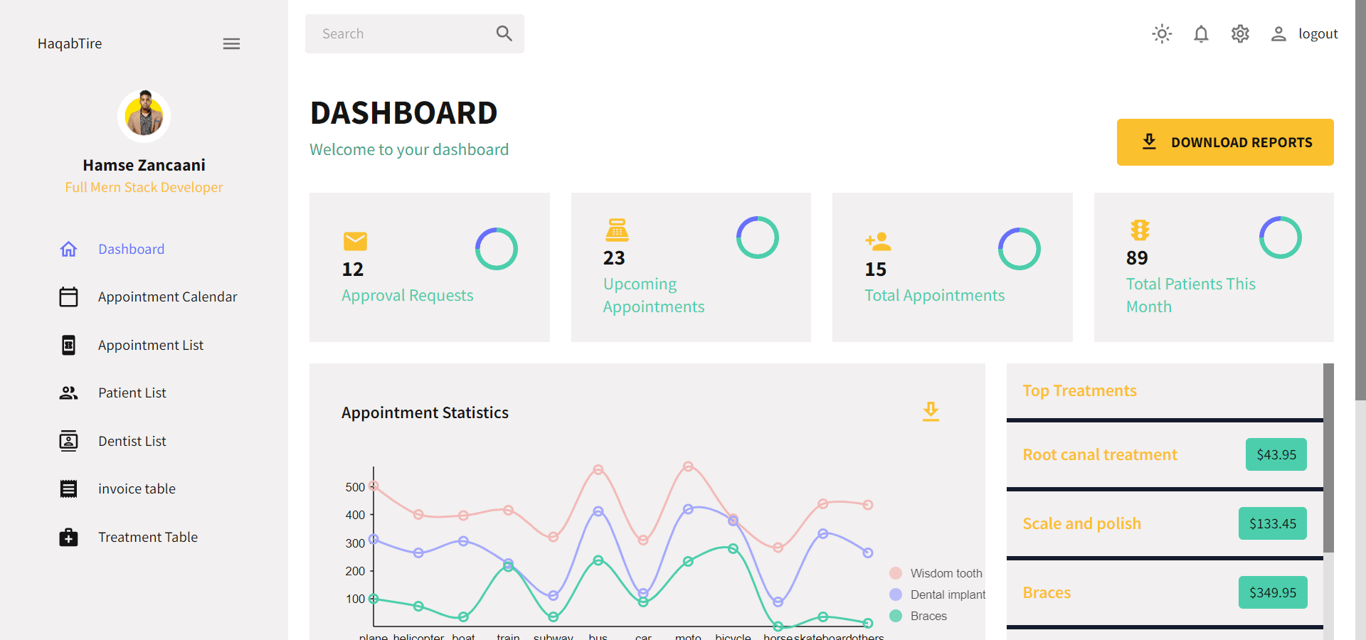 This is MERN stack dental management system a software application I designed specifically for dental practices, I build using the MERN stack, which stands for MongoDB, Express.js, React.js, and Node.js. This stack combines a powerful set of technologies for developing robust and efficient web applications.The dental management system aims to streamline various administrative and clinical processes within a dental practice to enhance efficiency and improve patient care